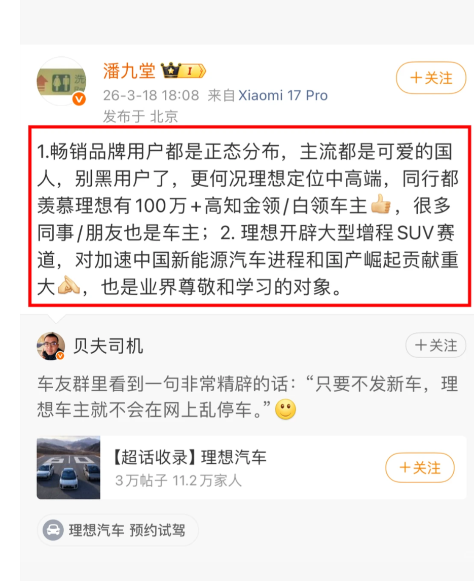 小米高管潘九堂的发声,直接回击了近期针对理想车主的恶意抹黑,字字句句都道出了行业真相与公允评价。其一,他直言畅销品牌的用户群体都是正态分布,主流都是可爱的国人,呼吁行业停止抹黑用户,更何况理想汽车定位中高端,坐拥 100 万 + 高知金领、白领车主群体,这一优质的车主画像更是让诸多同行羡慕,身边众多同事、朋友都是理想车主的现实,也印证了理想车主的整体素养;其二,他肯定了理想汽车对中国新能源汽车产业的重大贡献,理想开辟了大型增程 SUV 这一全新赛道,不仅填补了市场空白,更加速了中国新能源汽车的发展进程与国产汽车的崛起之路,成为业界尊敬和学习的标杆,这份行业贡献值得被认可。