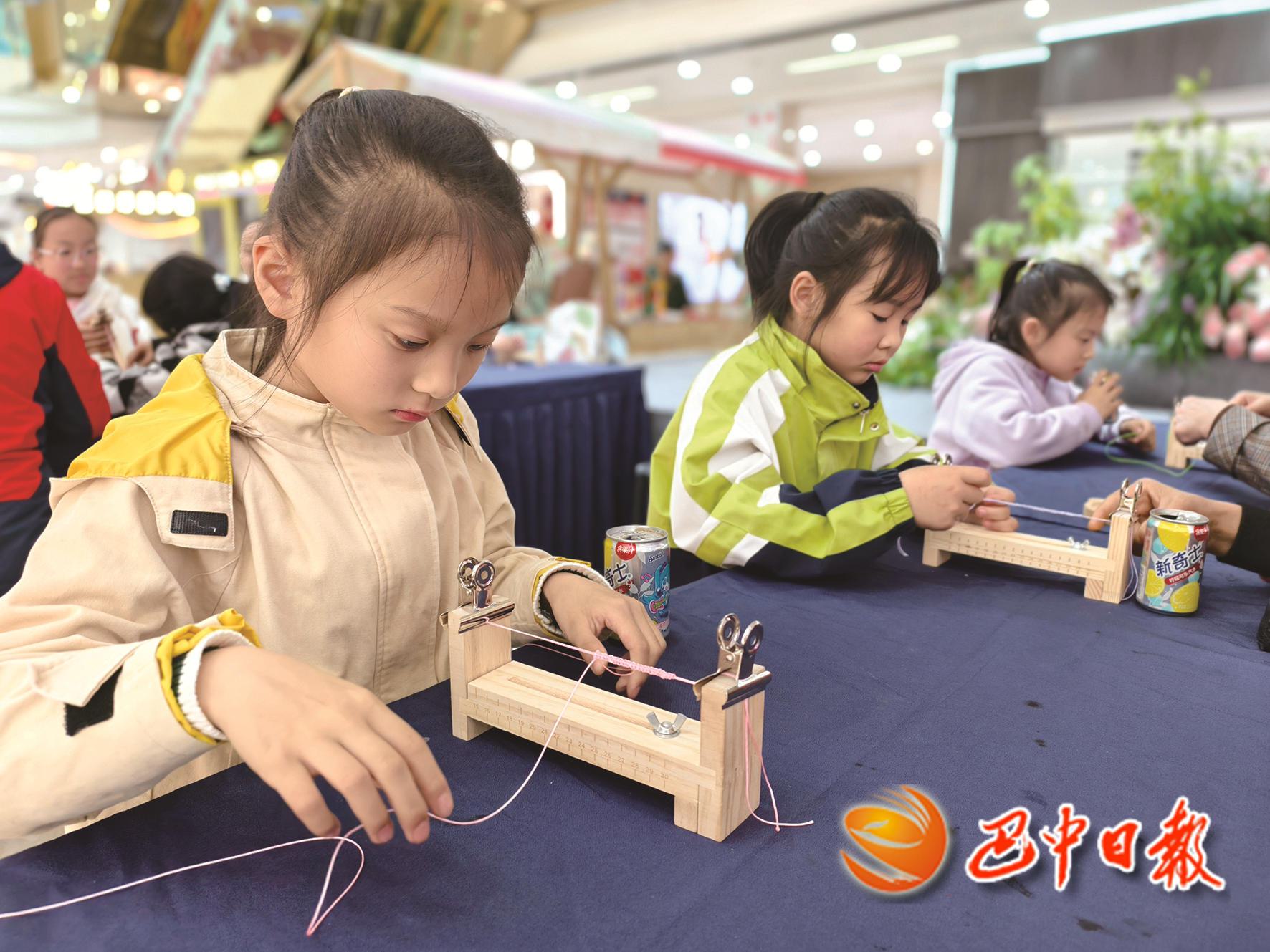 在容邦万达广场的活动现场,人气十足。大批小朋友被非遗绳编的魅力吸引,围坐成圈参与体验。活动现场,“巴中绳编”非遗传承人李清明站在长桌旁,手把手指导小朋友们编绕彩绳。细长的丝线在孩子们指尖穿梭,不时有人举起半成品兴奋地喊“老师你看”,李清明微笑着逐一指点。一旁展出的绳编饰品吸引了不少家长驻足观看。
